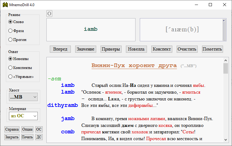 Кратко: верхнее левое окошко предназначено для вывода слов и фраз с примерами употребления. Новое слово или фраза выводится при нажатии кнопки "Вперед" - а правая кнопка мышки, нажатая на этой кнопке, возвращает предыдущее слово или фразу. Вывод осуществляется в случайном порядке, а в режиме прогона соответствует расположению слов в новелле. Поле поиска можно ограничивать, задавая хвосты (один или несколько), словники (основной или дополнительный) и охват - по всем словам ("Новеллы") или только по тем, которые вошли в конспект ("Конспекты"). Можно также вывести конкретное слово, наберя его в боксе "Слова". Выводимые слова можно помечать как усвоенные либо как "упрямые". В нижнем окошке выводятся значения слов, целые словники, новеллы и конспекты. Содержимое нижнего окошка можно вывести на печать. Английские слова, содержащиеся в новеллах, конспектах и словниках, представляют собой гиперссылки - кликнув на такое слово, вы получите его же в верхнем окошке. Сходное назначение имеют значки