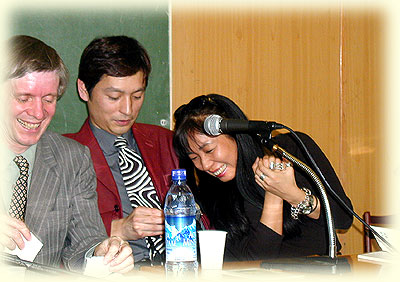 На семинаре задавались вопросы об образовании. О наших гостях я могу сказать следующее: Господин Симада учился в университете иностранных языков, и там изучал русский как основной. Также и Тавада Ёко-сан изучала русскую литературу в центре Токио, в университете Васэда. Но госпожа Тавада после окончания университета поехала в Германию и уже там училась писательству по-немецки.