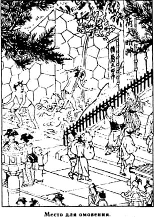 Избавляются от кэгарэ точно таким способом, к которому прибегает каждый в борьбе с грязью обыкновенной. То есть надо помыться. Ритуальное омовение называется в синто мисоги, и оно должно следовать после каждого контакта с любым объектом или состоянием, вызывающим кэгарэ. Логика здесь проста и понятна, как требование мыть руки перед едой. Наиболее полное очищение достигается погружением всего тела в воду или же обливанием. В последнем случае соблюдается строгая последовательность. Сначала омывается нижняя часть тела, затем плечи и грудь, а потом уже голова. Мифологическим прецедентом этому обряду служит, конечно же, купание бога Идзанаги после посещения им преисподней. Именно к нему восходит обычай мыть руки и ополаскивать рот перед входом в святилище, о котором мы уже говорили.